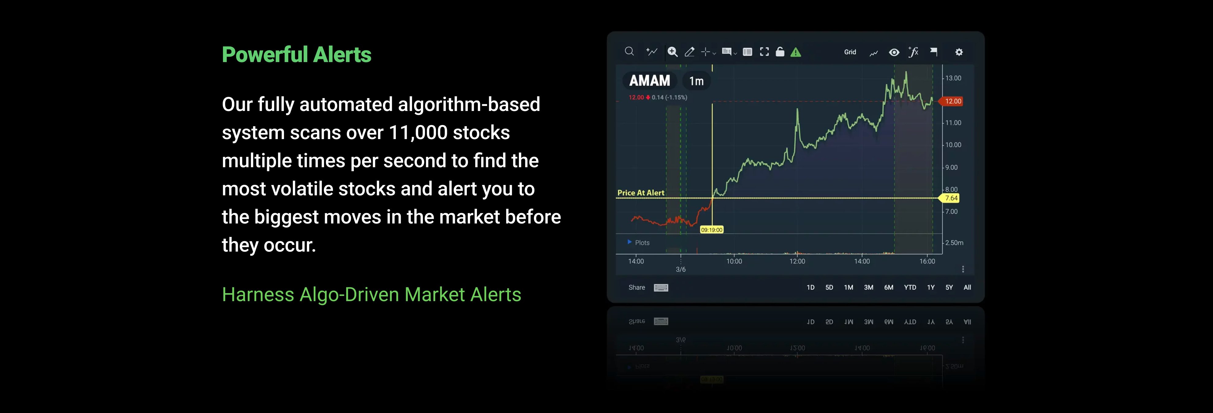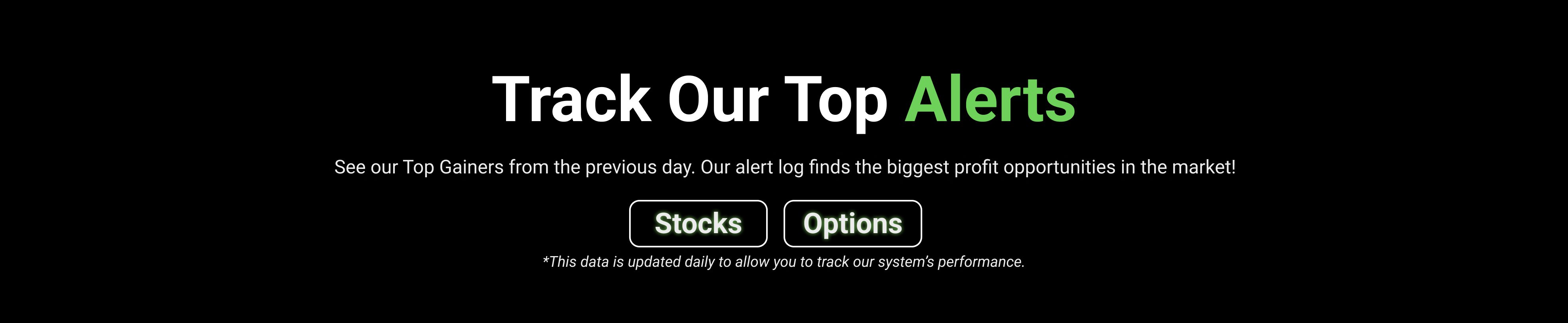 We are distinctly different than any other trading system on the market. Long before the market opens, our system scans the exchanges using proprietary algorithms to find the most active stocks. Our fully automated scanners then send you alerts to explosive opportunities in the market in real time. Once an alert is posted, you can click on the symbol and find out why that stock received an alert. Then use our advanced charting tools and proprietary volatility indicator to see which stocks are breaking out and posting the biggest gains.